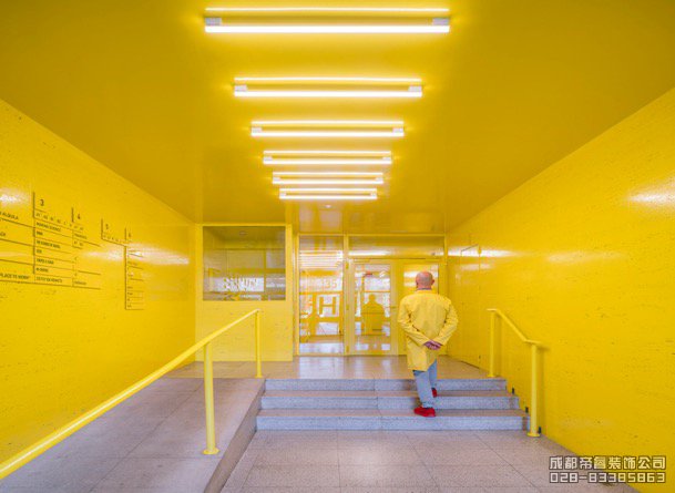 將過(guò)道的頂面墻面全部涂成黃色,給人帶來(lái)另一種視覺效果。醒目的黃色使得空間更加跳躍,具有引導(dǎo)作用。頂面簡(jiǎn)單的LED燈具很好的為空間提供照明,也不會(huì)給人繁雜的感覺。